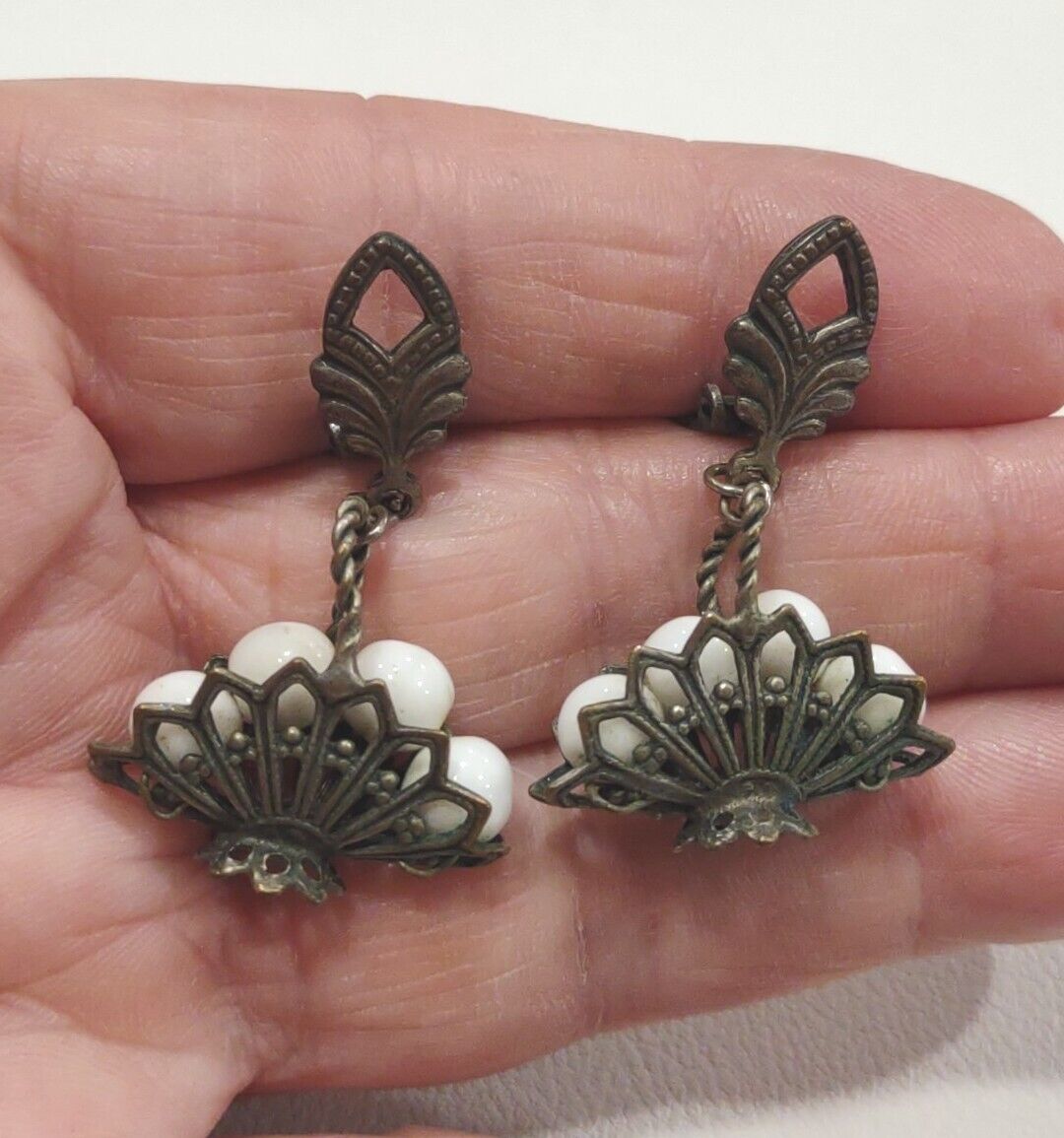 Vintage Silver Tone White Milk Glass Beaded Dangle Basket Clip On Earrings N67