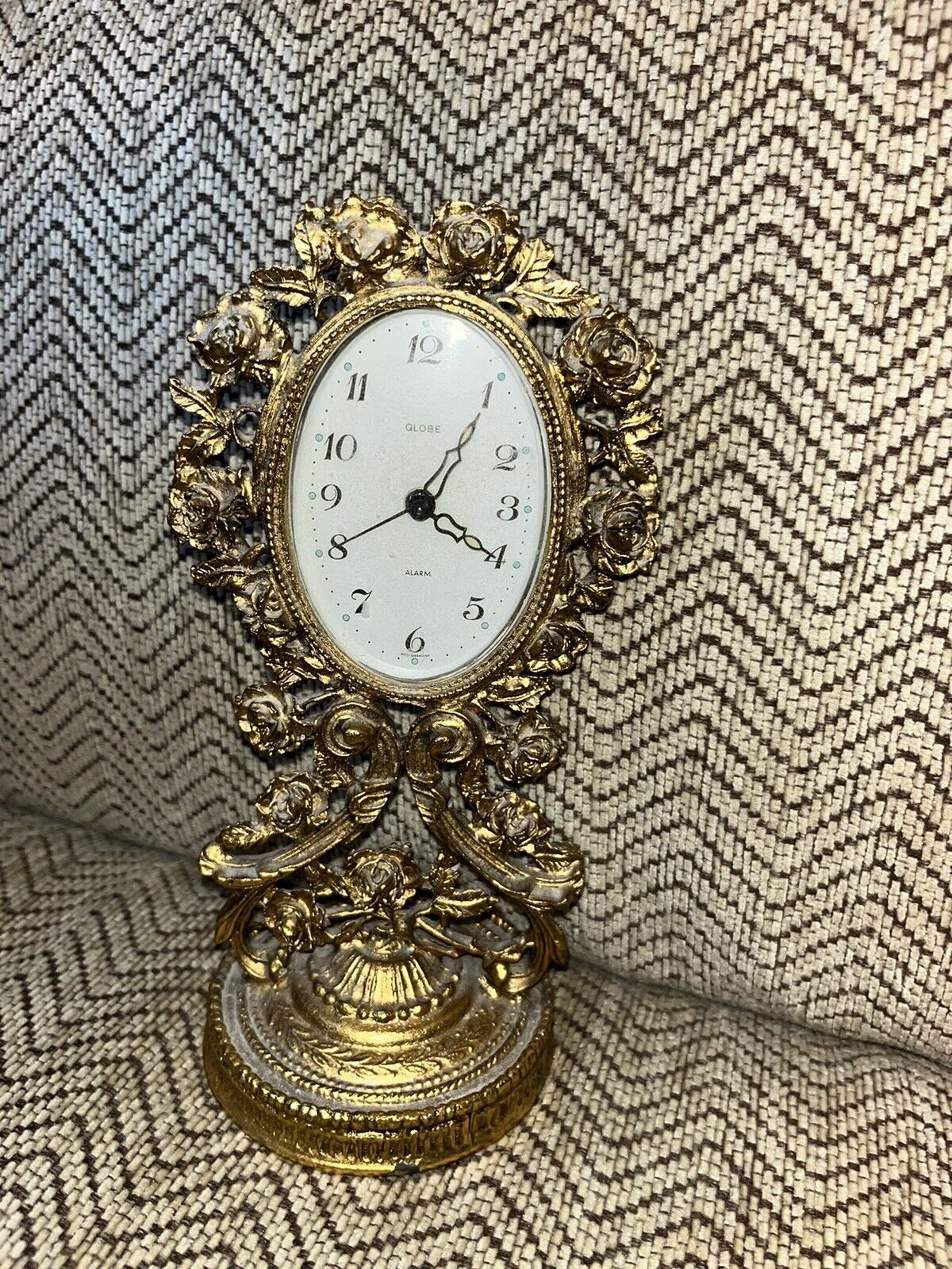 Title (ebay affiliate link): Rare Vintage West German Gold Rose Mantel Alarm Clock. Working 100 Globe Brand