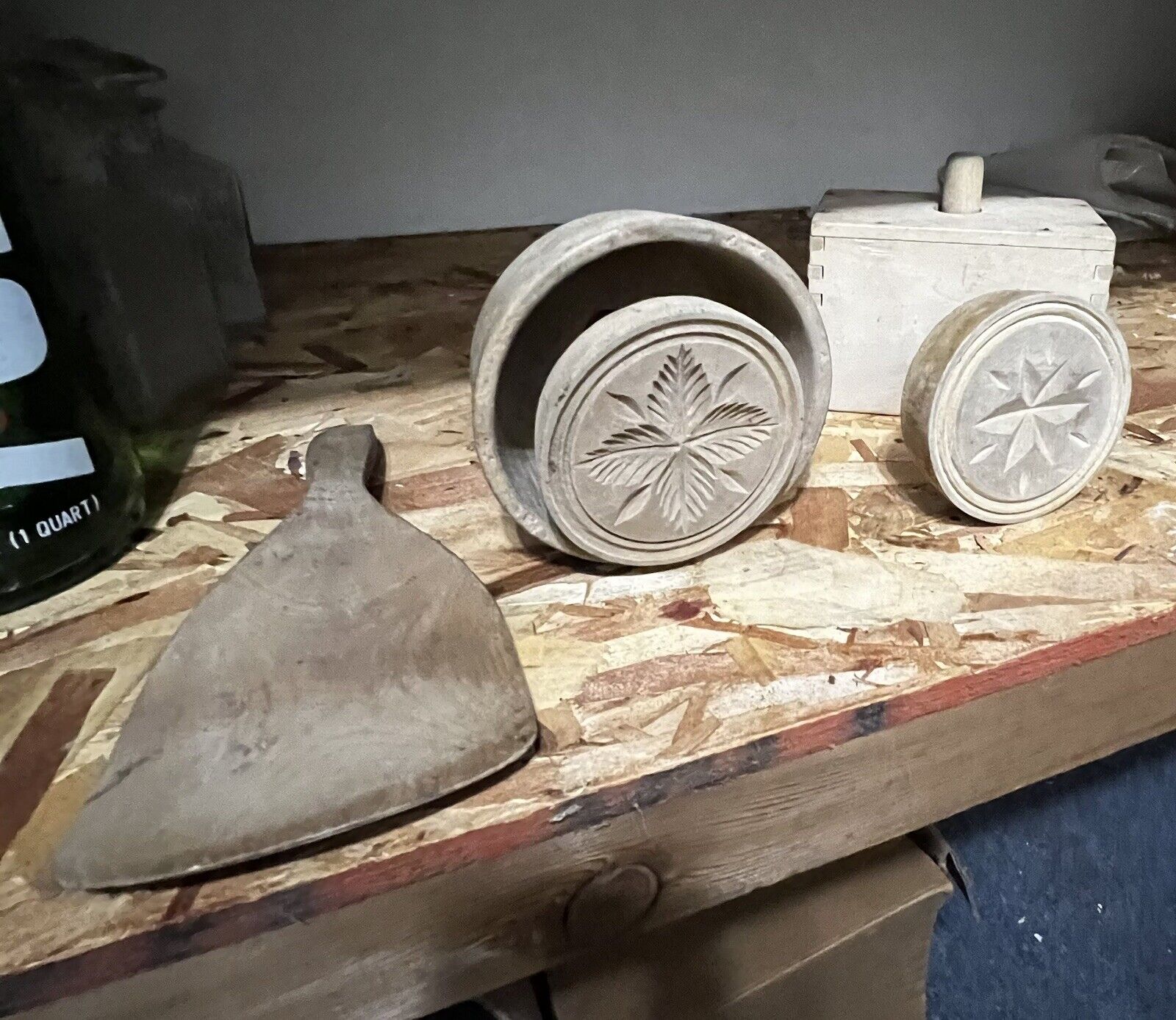 Antique Wooden Butter Molds Rectangle Press Wood Dovetail Joints Round Press.