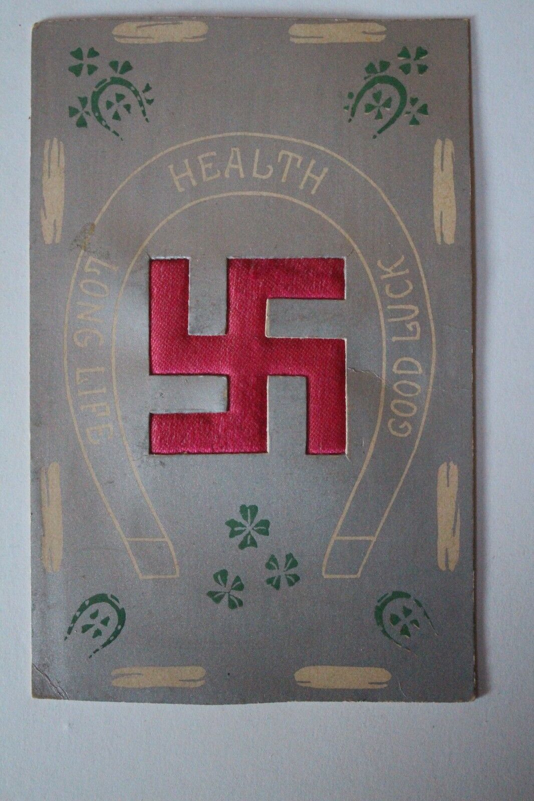 Title (ebay affiliate link): 1909 Antique Fabric Swastika Postcard Good Luck Long Life Health Horseshoe