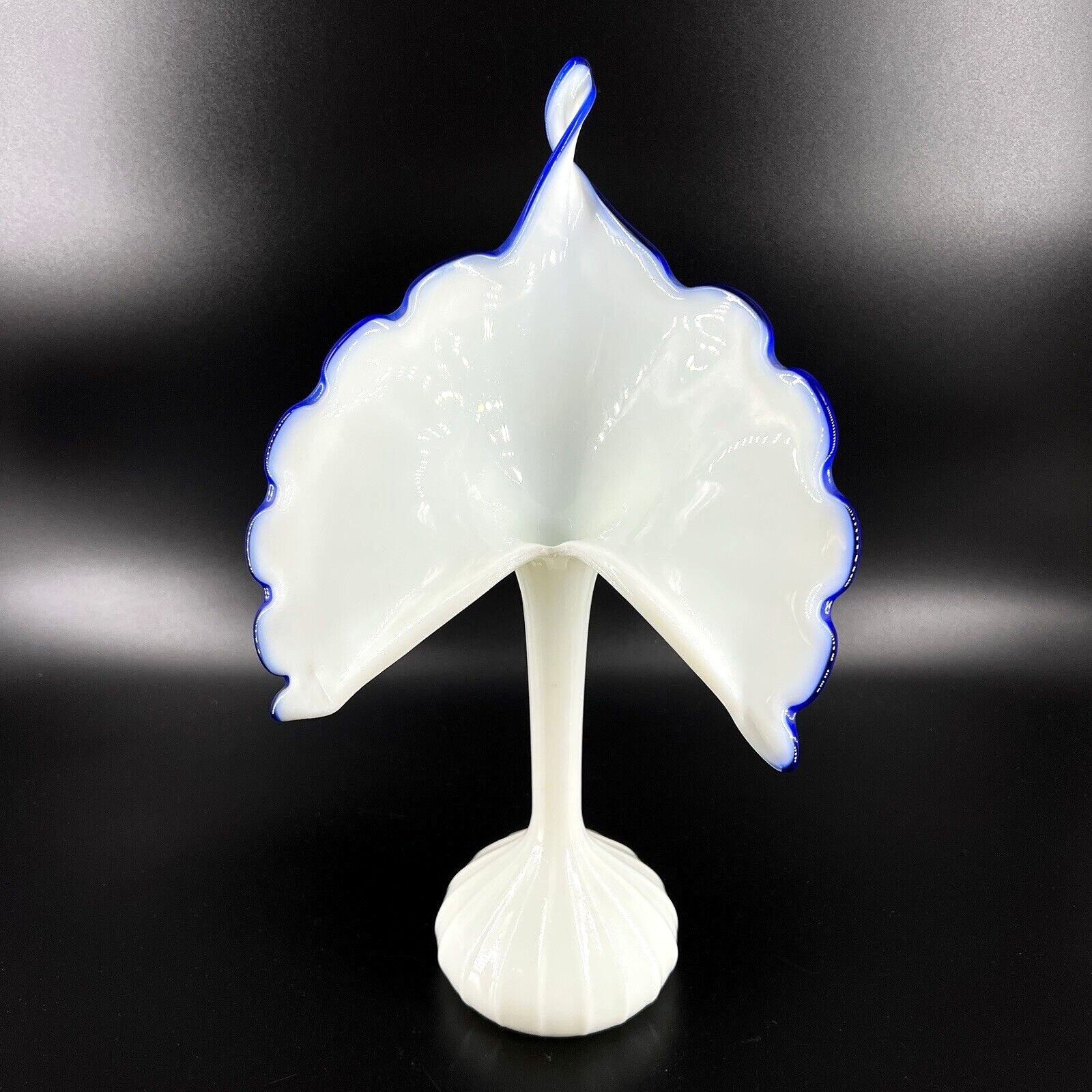 Vintage Hand Blown Milk Glass Jack in the Pulpit Cobalt Crest Vase
