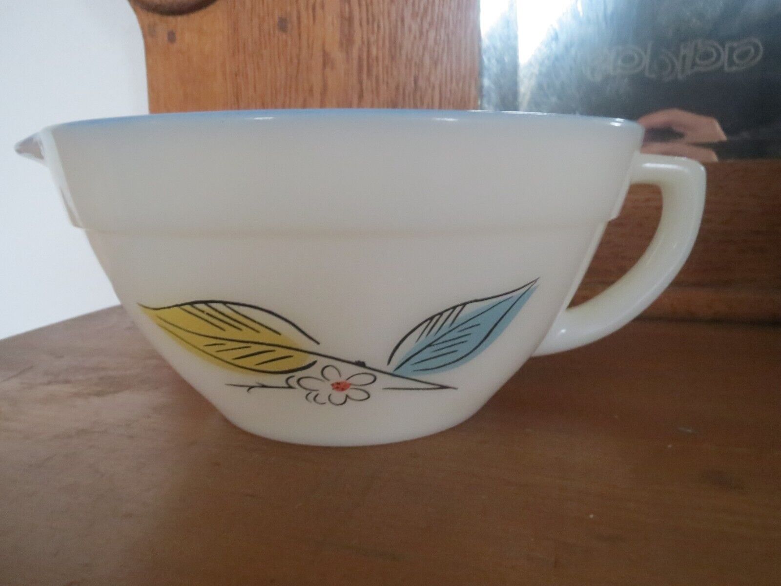 Title (ebay affiliate link): Vintage Fire King Milk Glass Batter Bowl Blue Yellow Floral