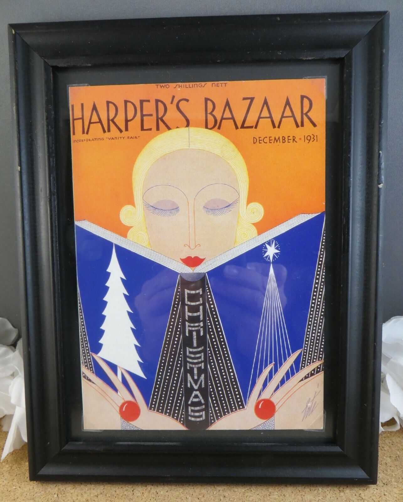Title (ebay affiliate link): ERTE Framed Harpers Bazaar Christmas Cover Art Deco Lady Woman December 1931