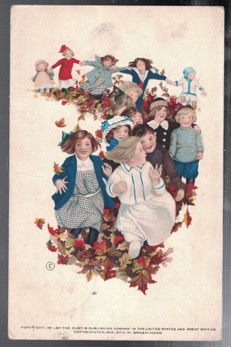ANTIQUE 1912 KIDS PLAY IN LEAVES SUNDAY SCHOOL RALLY DAY UNUSED POSTCARD