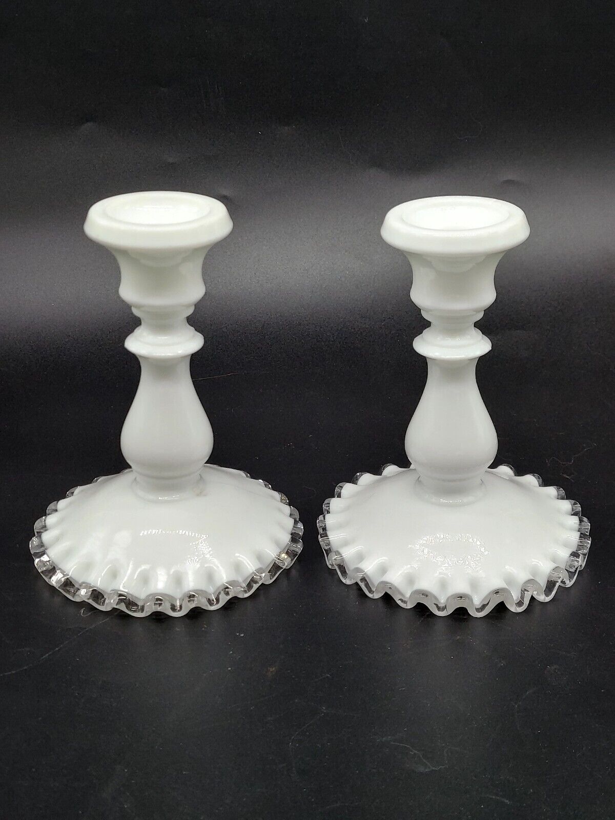 Title (ebay affiliate link): Set of 2 Vintage FENTON Silver Crest White Milk Glass 634 Candlestick Holders