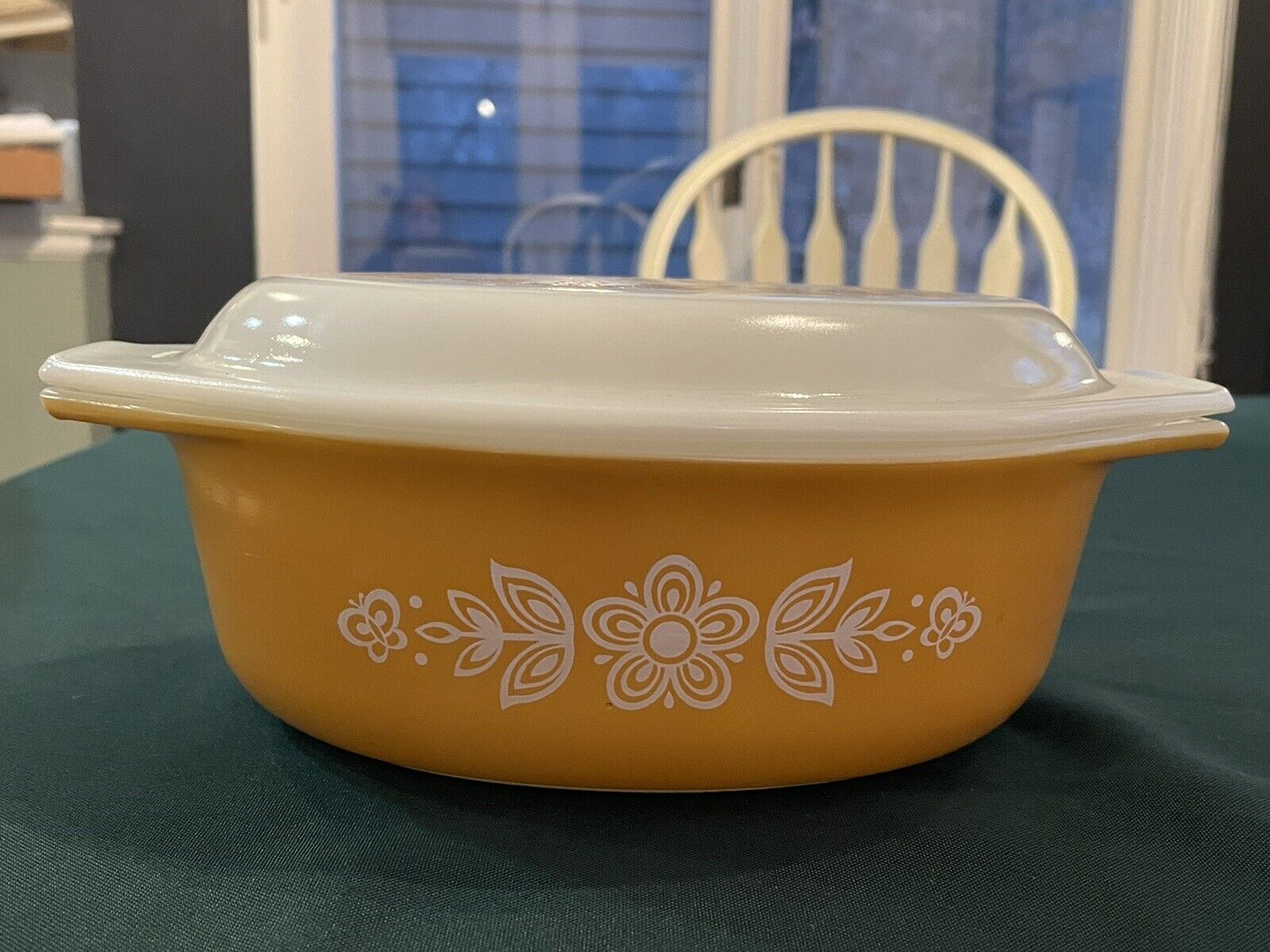 Title (ebay affiliate link): VTG Pyrex Butterfly Gold 043 11/2 Quart Oval Casserole Dish with Original Lid