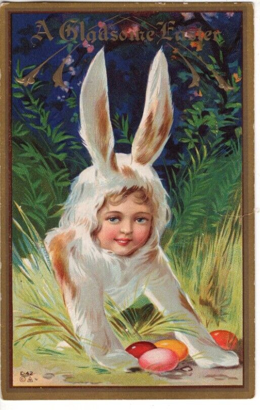 Title (ebay affiliate link): ANTIQUE EMBOSSED EASTER Postcard YOUNG GIRL DRESSED AS BUNNY COLORED EGGS