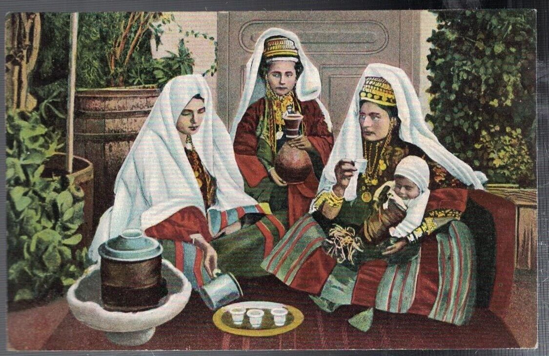 ANTIQUE 1910 TYPICAL WOMEN OF BETHLEHEM ISRAEL DRINKING TEA POSTCARD
