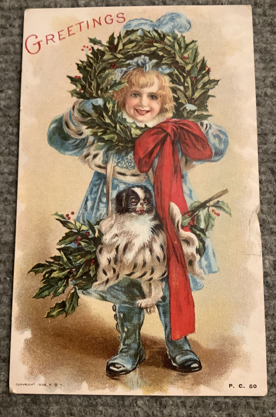 Vintage Christmas Postcard little girl with Pekingese dog antique