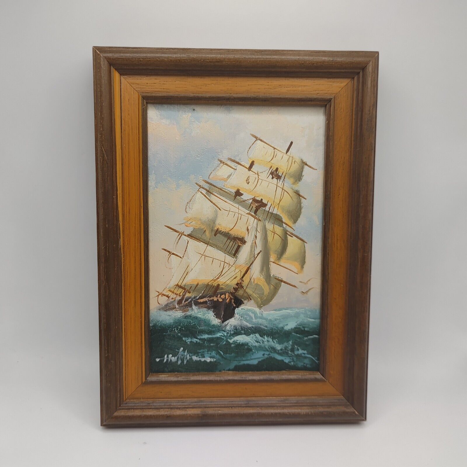 Original Oil on PANEL Signed Ship Sails Painting Framed VINTAGE FRAMED 5X7