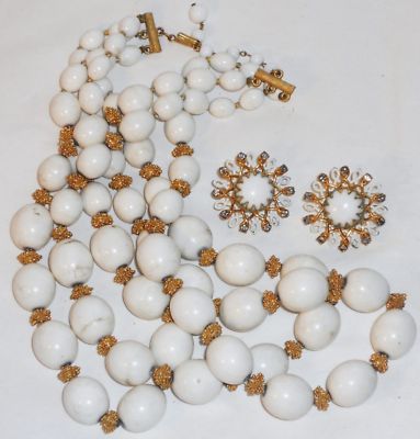 MILKGLASS~KRAMER EARRINGS & TRIFARI 3 STRAND NECKLACE