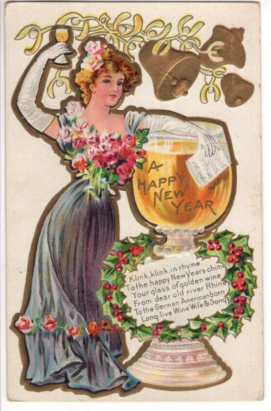 Title (ebay affiliate link): ANTIQUE EMBOSSED NEW YEAR Postcard YOUNG LADY HOLDING CHAMPAGNE FOR TOAST