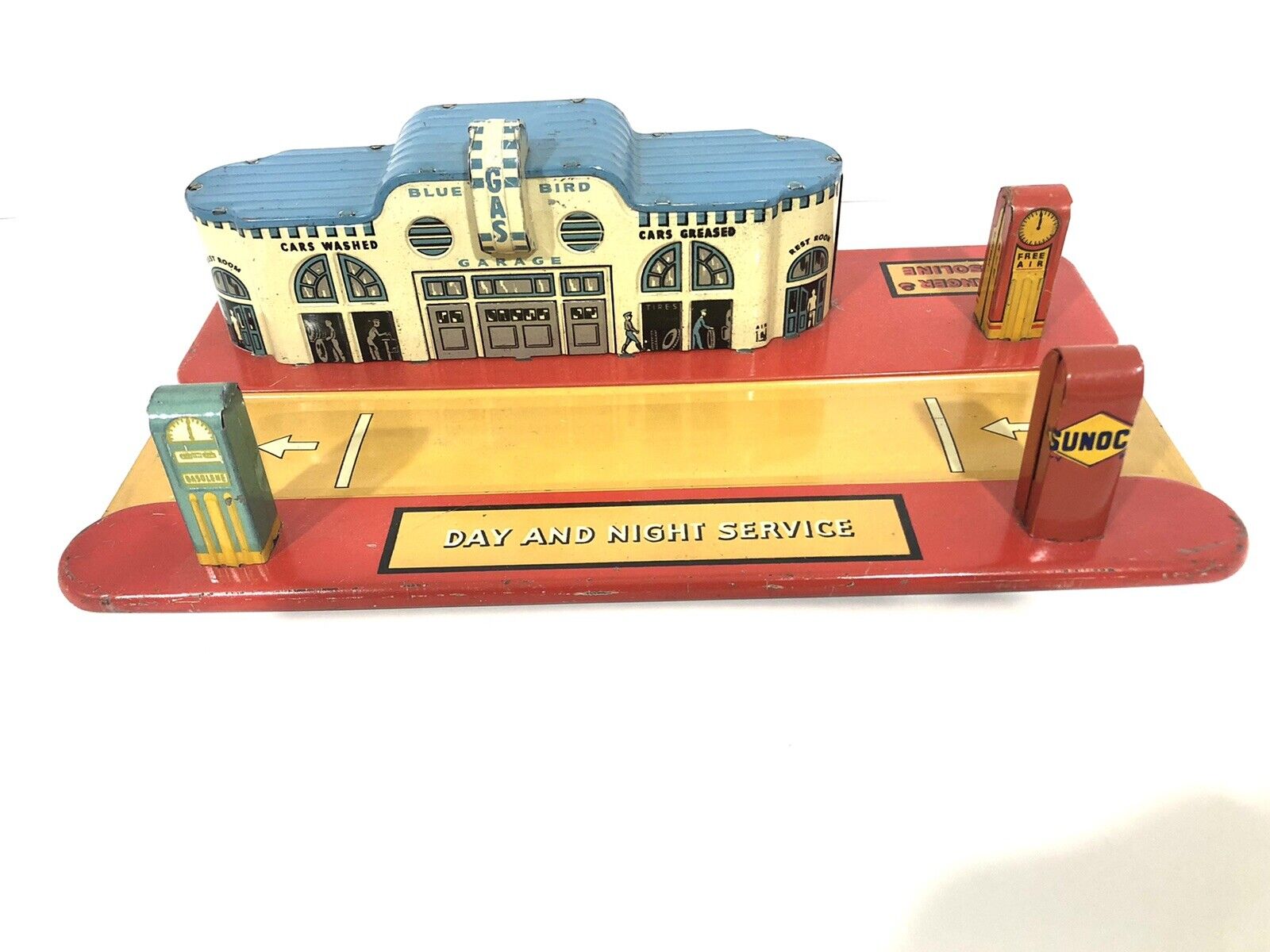 Marx Toy Tin 1930s Blue Bird Gas Station Garage . With Sunoco Pump train Set