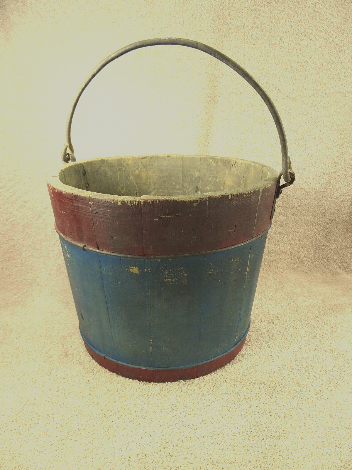 Title (ebay affiliate link): Antique Painted Wooden Red and Blue Bucket w/Bail Handle