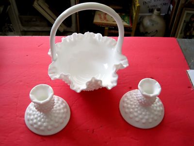Vtg Fenton Hobnail Basket & Candlesticks Milk Glass EC