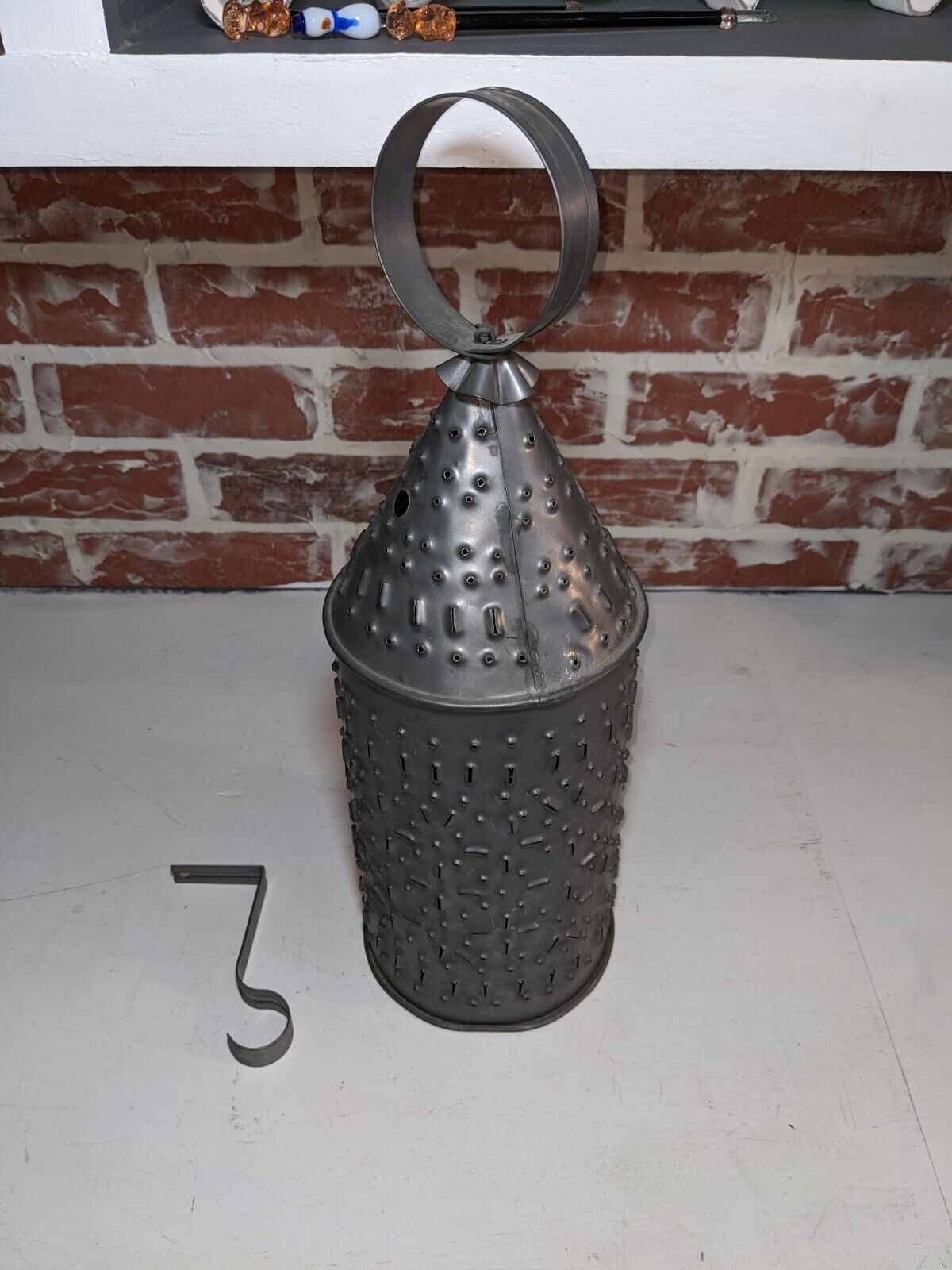 Title (ebay affiliate link): VINTAGE HEAVY GAGE PUNCHED TIN LANTERN HANGING CANDLE LAMP ESTATE FIND
