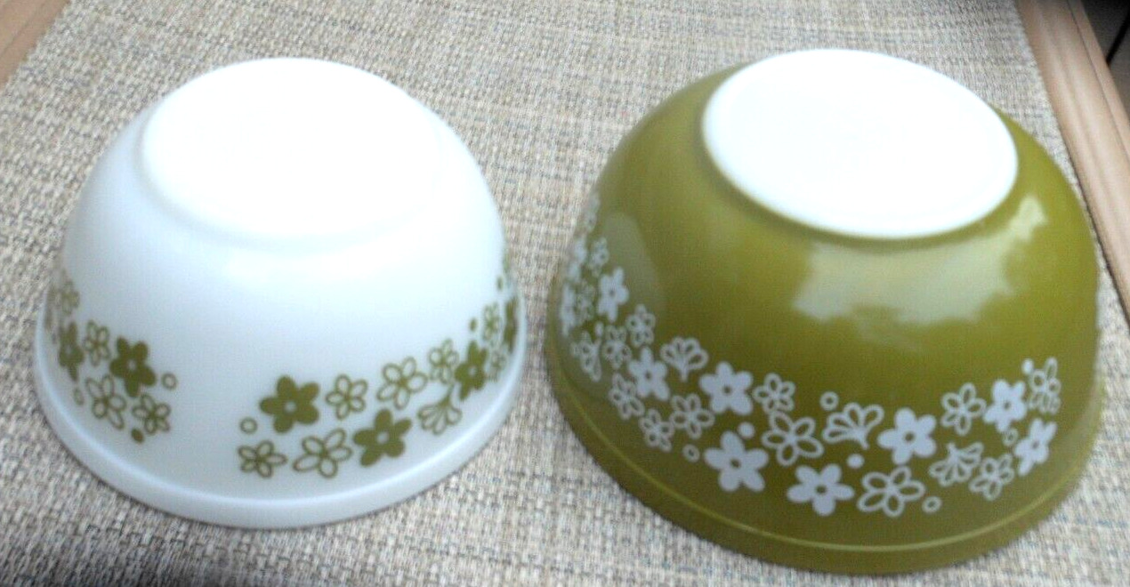 Title (ebay affiliate link): 2 Vintage Pyrex CRAZY DAISY Spring Blossom Nesting Bowls Green White