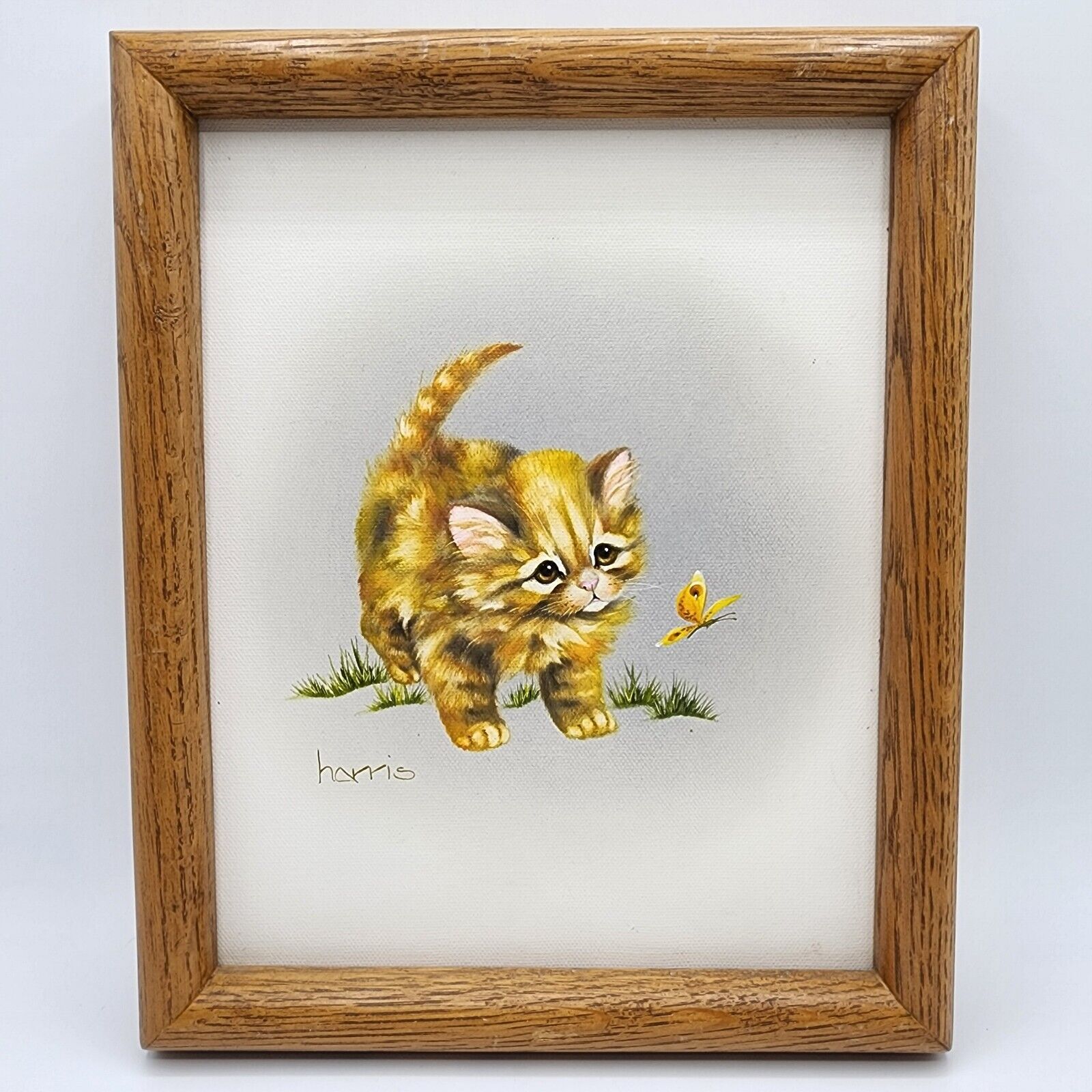 Title (ebay affiliate link): Vintage Peggy Harris Framed Fraidy Cat Painting Signed Kitten w Butterfly