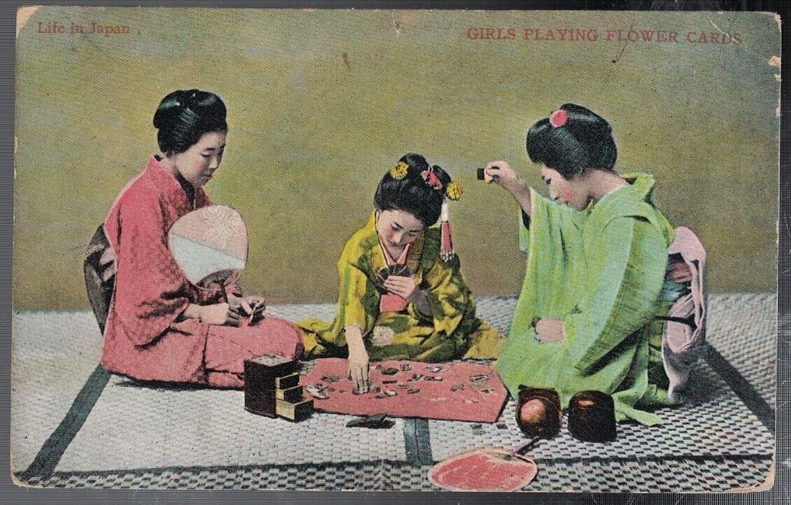 ANTIQUE 19071910 LIFE IN JAPAN GEISHA GIRLS PLAYING FLOWER CARD GAME POSTCARD