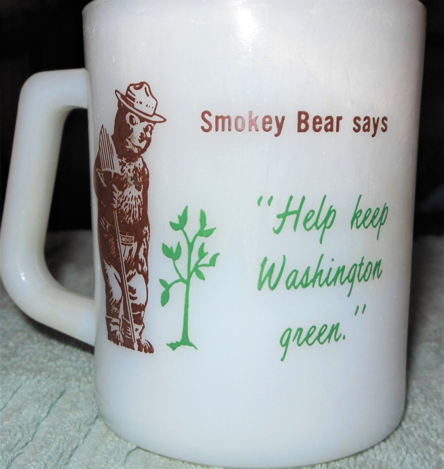 Vintage SMOKEY BEAR Milk Glass Coffee Mug Cup 34Help Keep Washington Green34