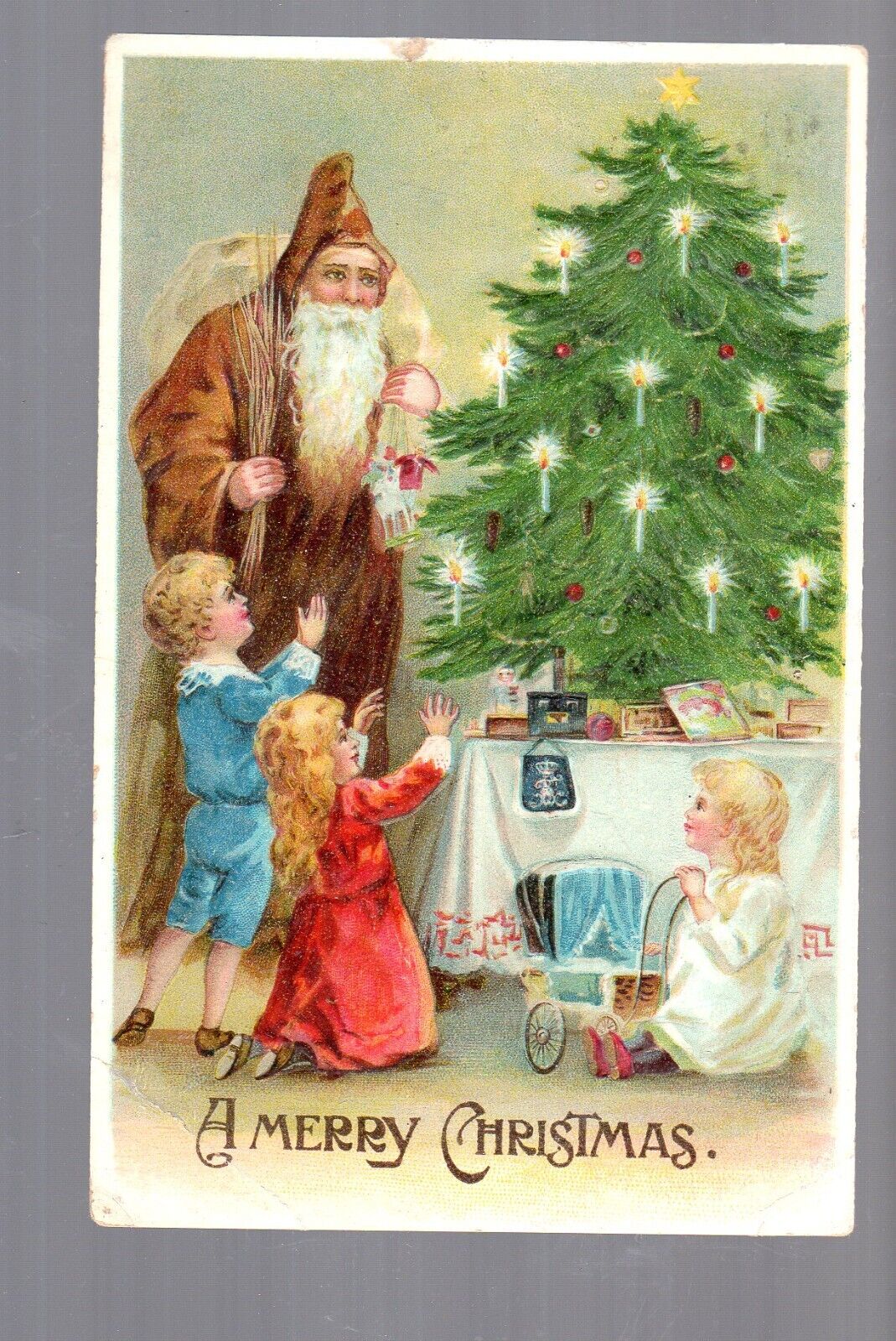 Q700 Antique Postcard Christmas Santa Claus brown suit corner creases
