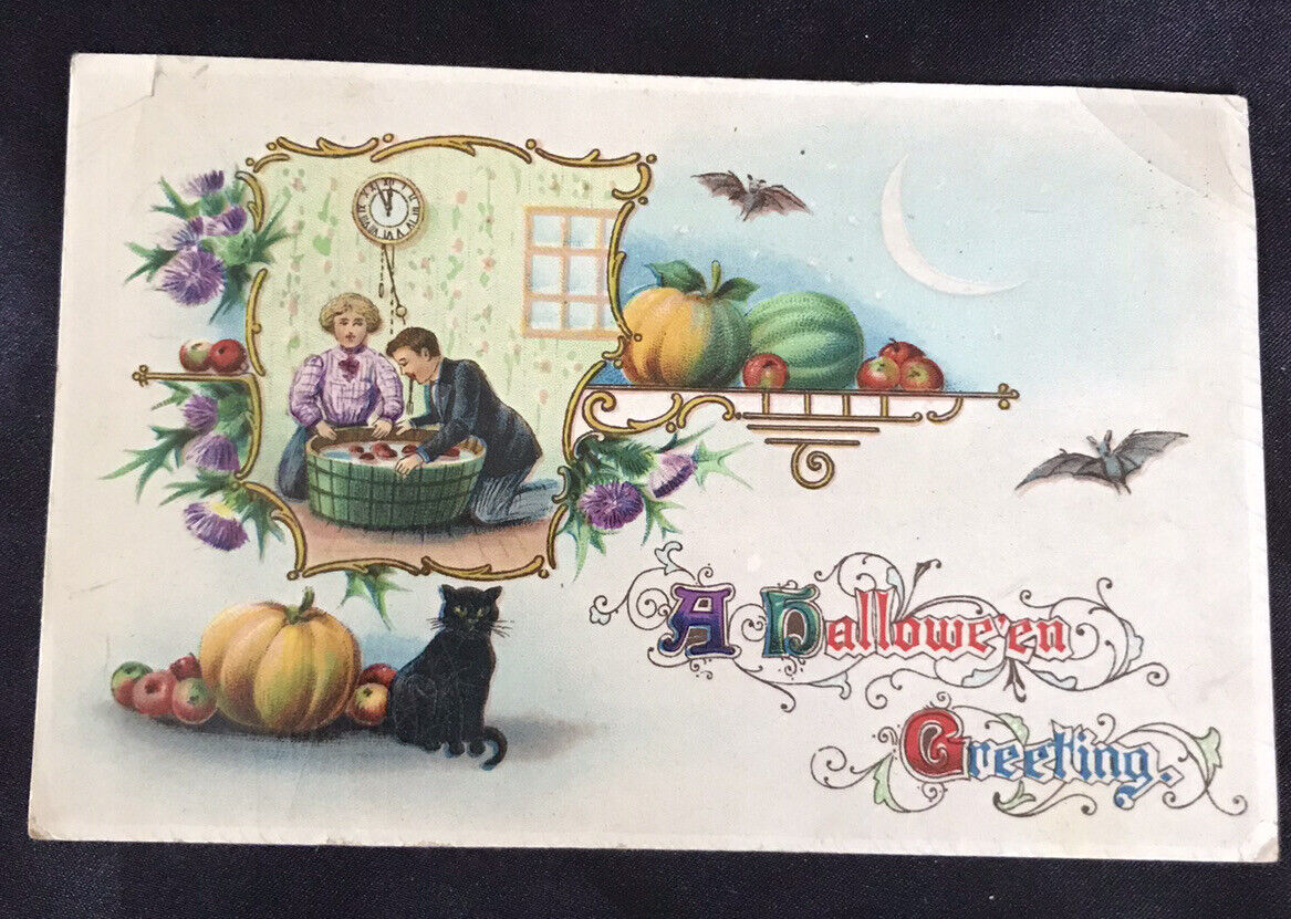 Antique Gottschalk D D Gel Halloween Postcard Apple Bobbing Black Cat and Bats