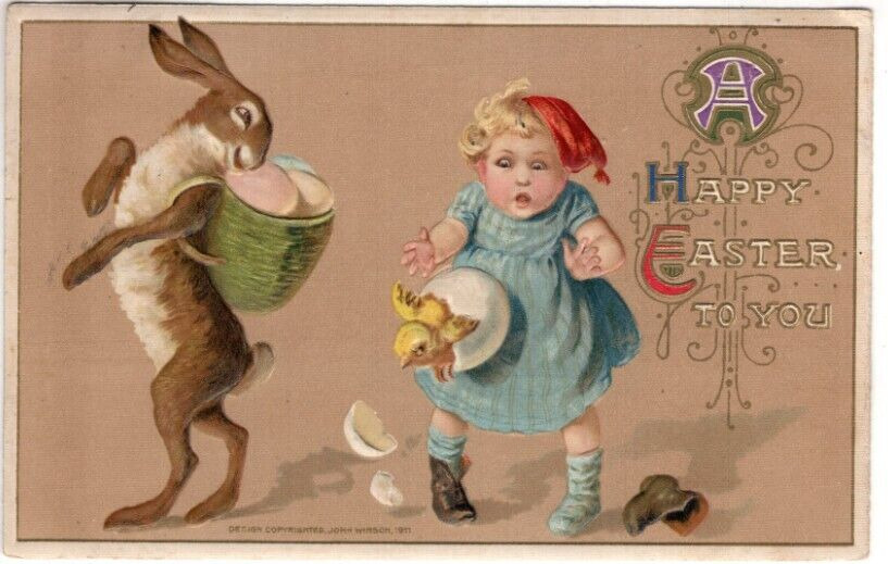 Title (ebay affiliate link): ANTIQUE EASTER Postcard JOHN WINSCH BUNNY BASKET OF EGGS ON BACK GIRL