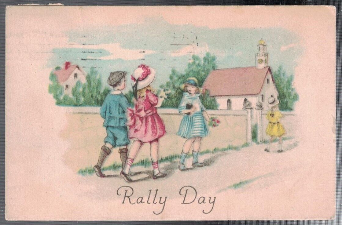 ANTIQUE 1924 SUNDAY SCHOOL RALLY DAY KIDS WALK TO CHURCH POSTCARD