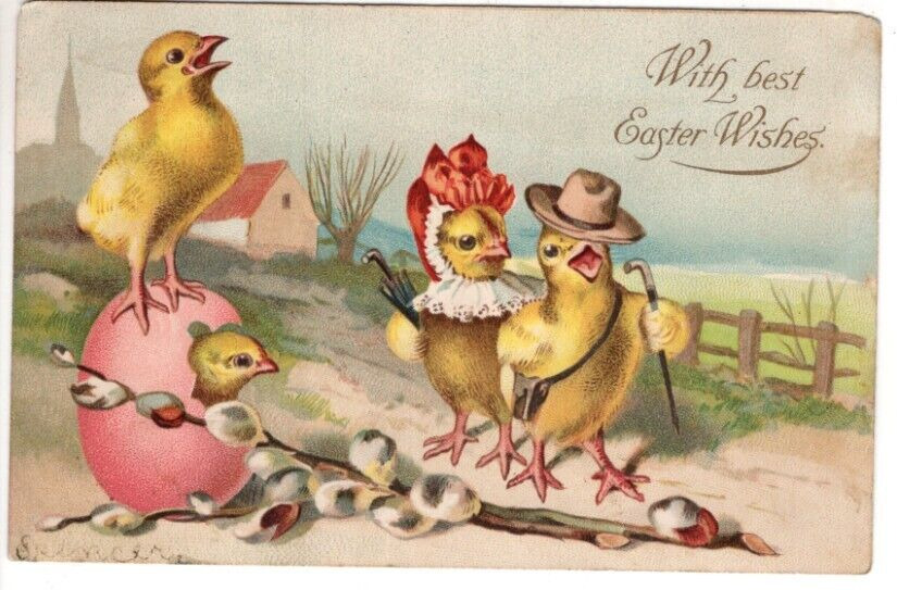 Title (ebay affiliate link): ANTIQUE EASTER Postcard DRESSED MR. AND MS. CHICK PUSSYWILLOWS COLORED EGG