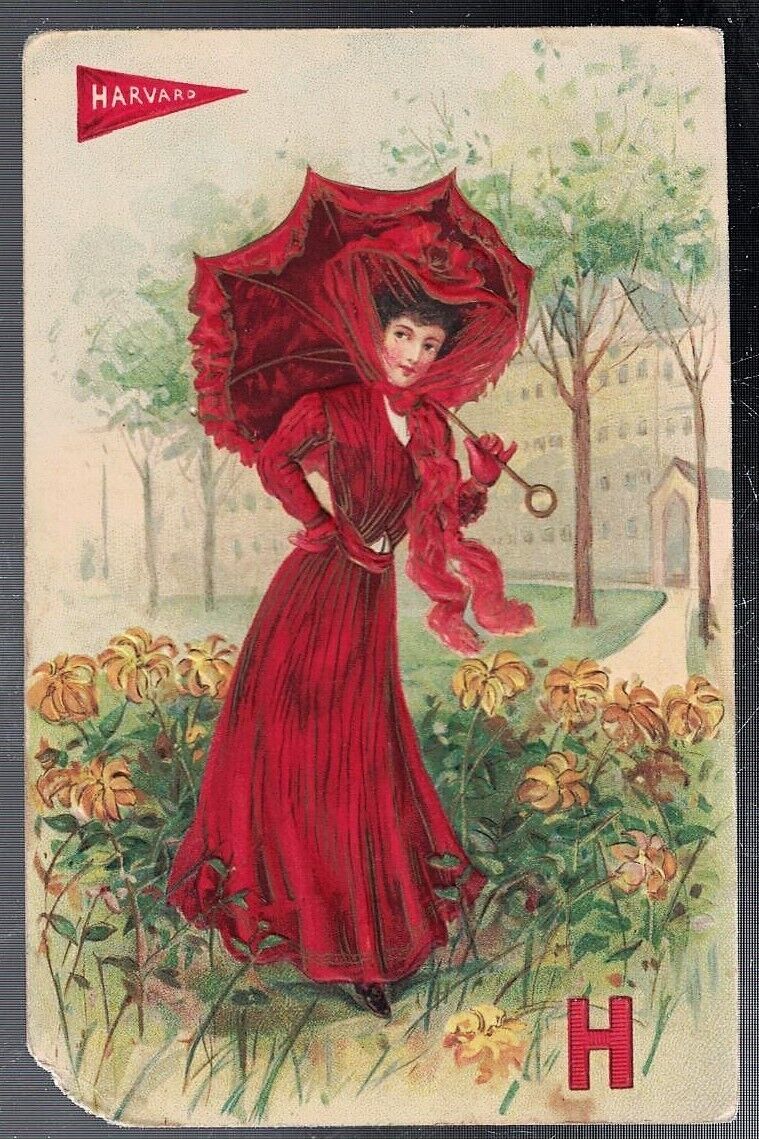 Title (ebay affiliate link): ANTIQUE 19071910 HARVARD COLLEGE GIRL DRESSED ALL IN RED PENNANT POSTCARD