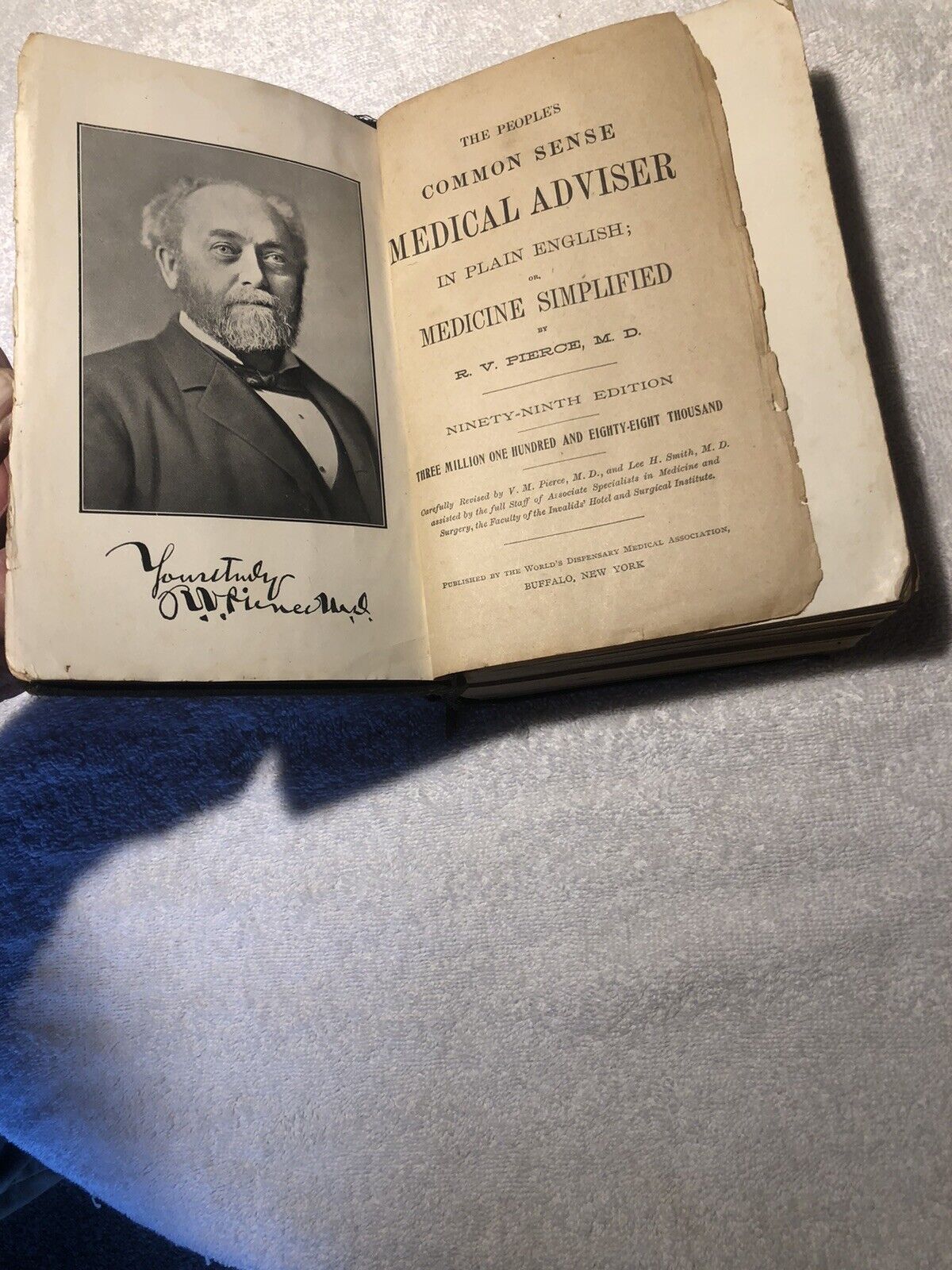 Title (ebay affiliate link): ANTIQUE HARDCOVER THE PEOPLES COMMON SENSE MEDICAL ADVISER BOOK 1918 BY RV PIERC