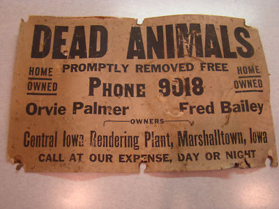 1950's Vintage DEAD ANIMALS REMOVED FREE Farm Sign