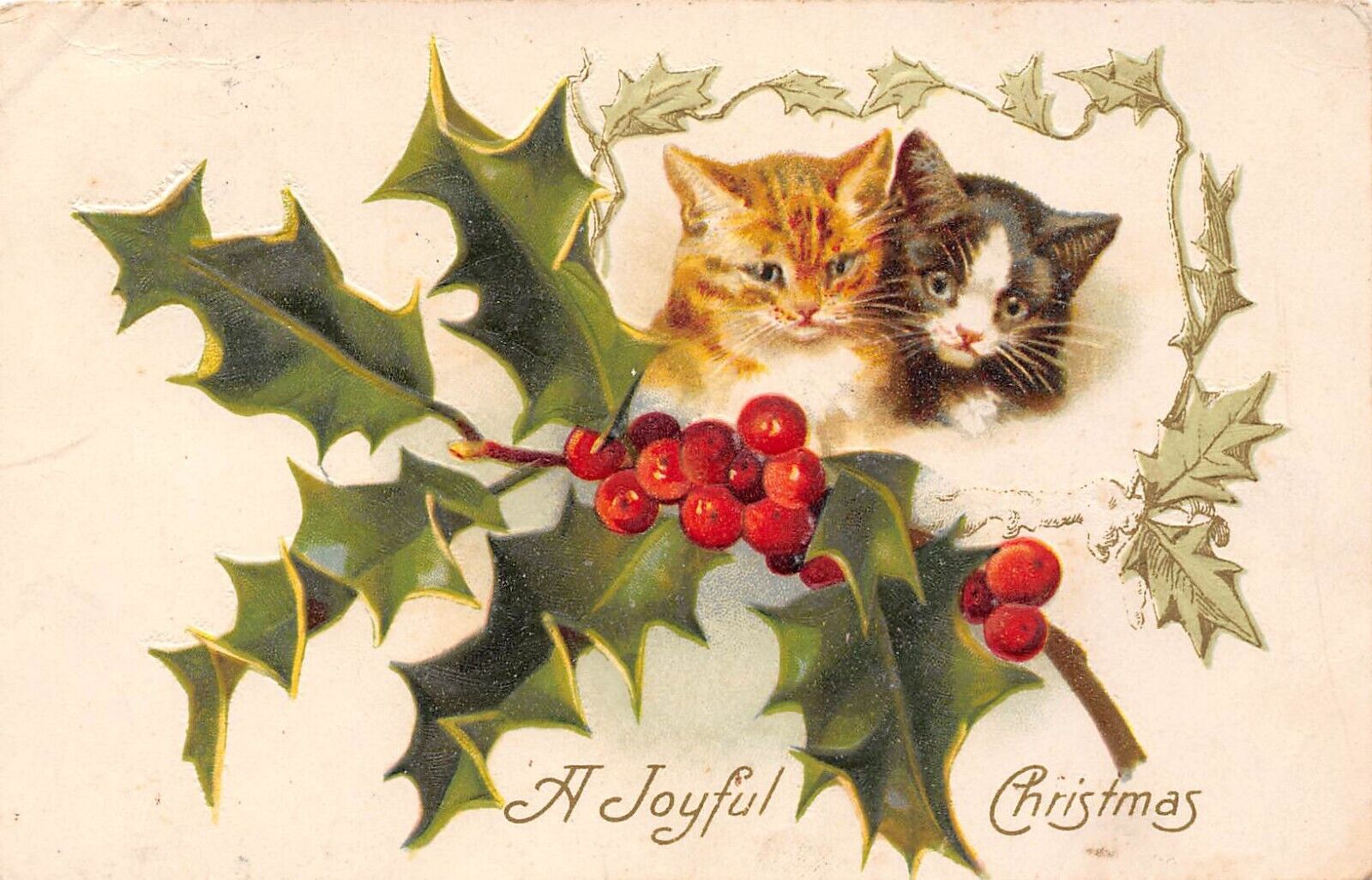 C8984 34A Joyful Christmas34 Two Kittens and Holly Antique Postcard Embossed