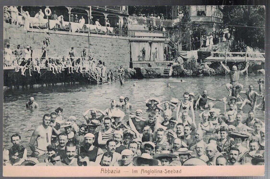 ANTIQUE 1910 MANY BATHERS POSING IM ANGIOLINA SEEBAD ABBAZIA CROATIA POSTCARD