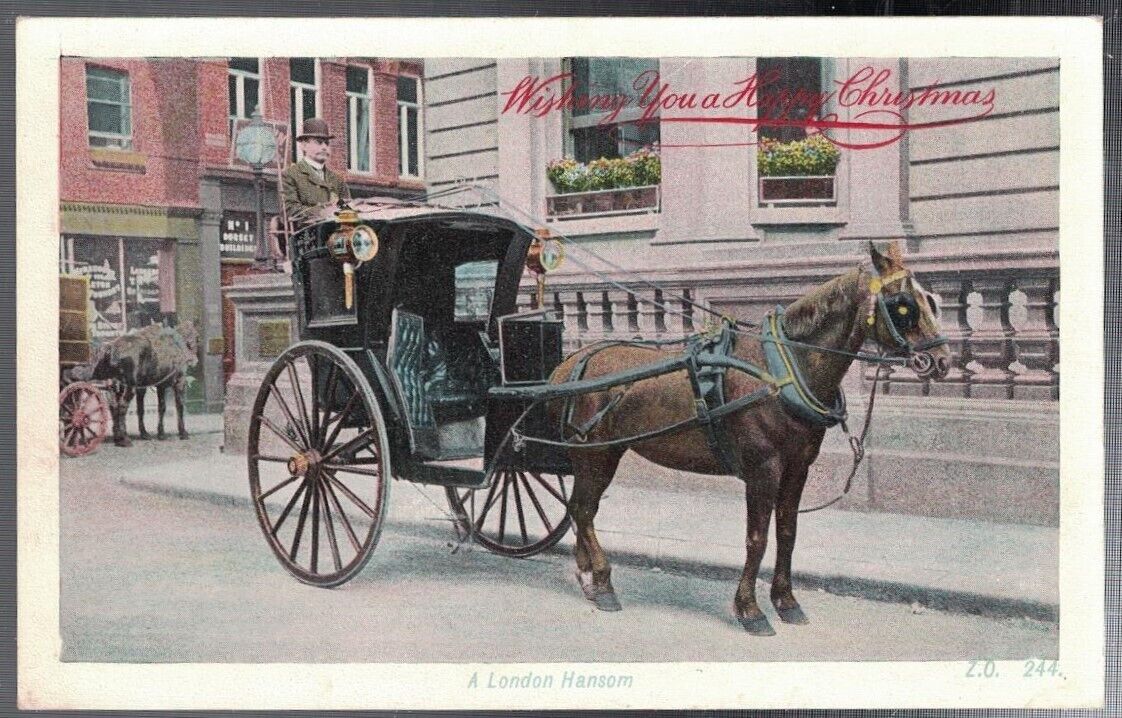 ANTIQUE 1910 A LONDON HANSOM CAB CARRIAGE ENGLAND MERRY CHRISTMAS POSTCARD