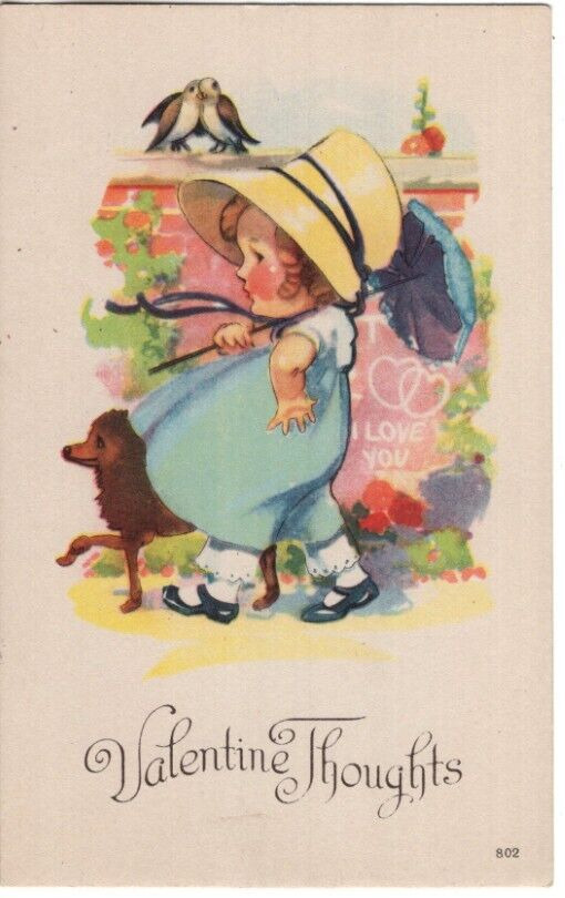 Title (ebay affiliate link): ANTIQUE VALENTINE Postcard YOUNG GIRL WALKING WITH HER POODLE BIRDS ON LEDG