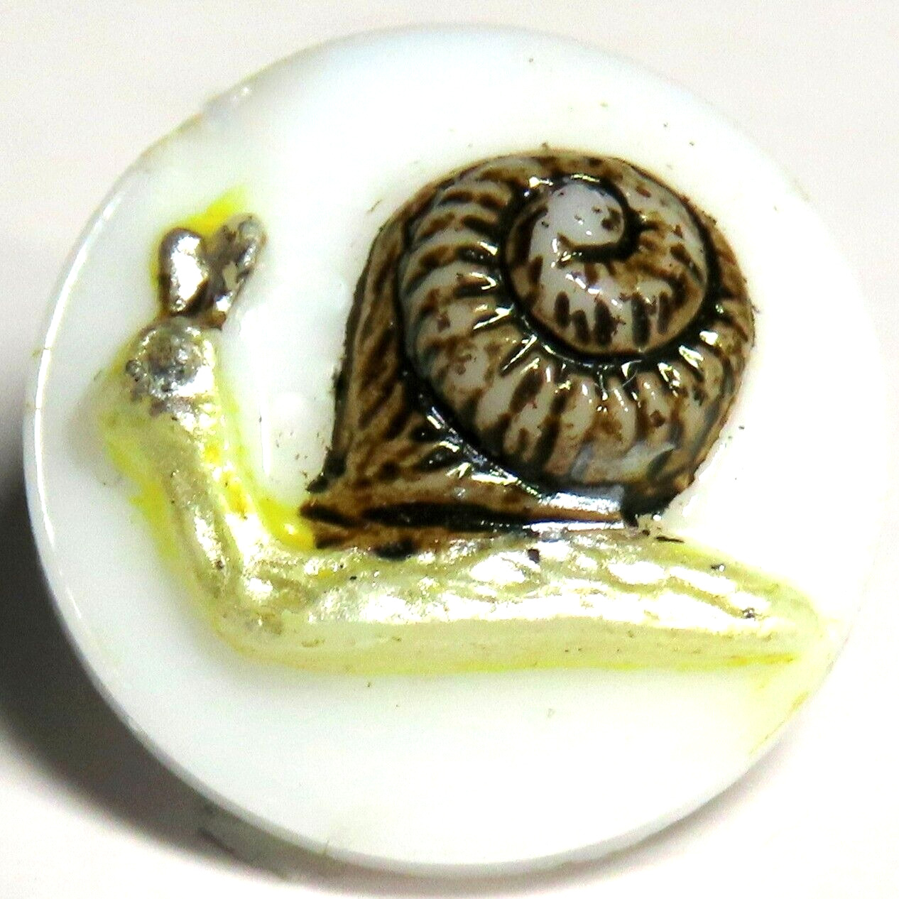 Title (ebay affiliate link): 1940S MILK GLASS CHILDS BUTTON w/LITTLE ENAMELED 34SNAIL34