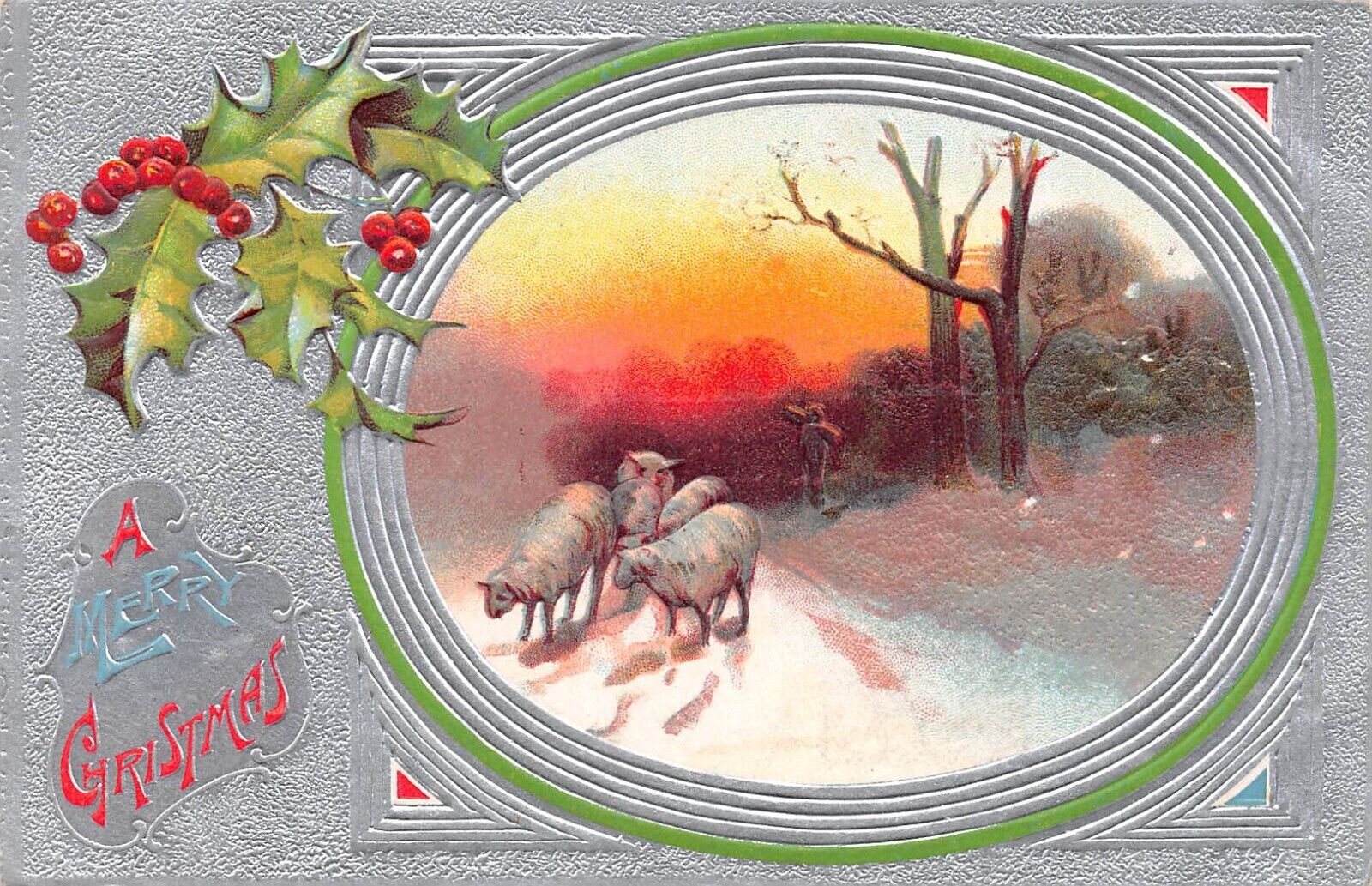 C8988 34A Merry Christmas34 View of Sheep Holly on Silver Antique Postcard Emb.