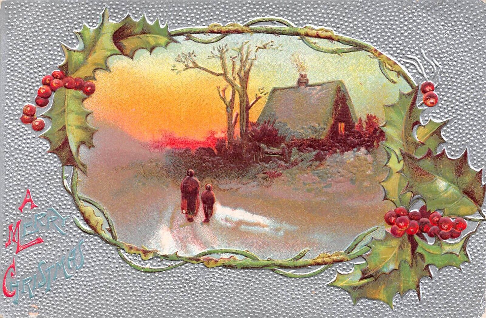 C8987 A Merry Christmas Rural Winter View Holly on Silver Antique Postcard Emb.
