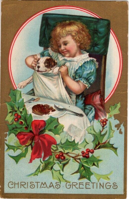 Title (ebay affiliate link): ANTIQUE EMBOSSED CHRISTMAS Postcard YOUNG GIRL PUTTING BIB ON PUPPY