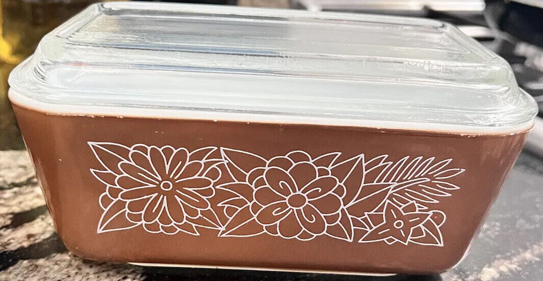 Title (ebay affiliate link): Pyrex •Woodland Brown Flower 502 B Refrigerator Dish With Lid• Sparkling