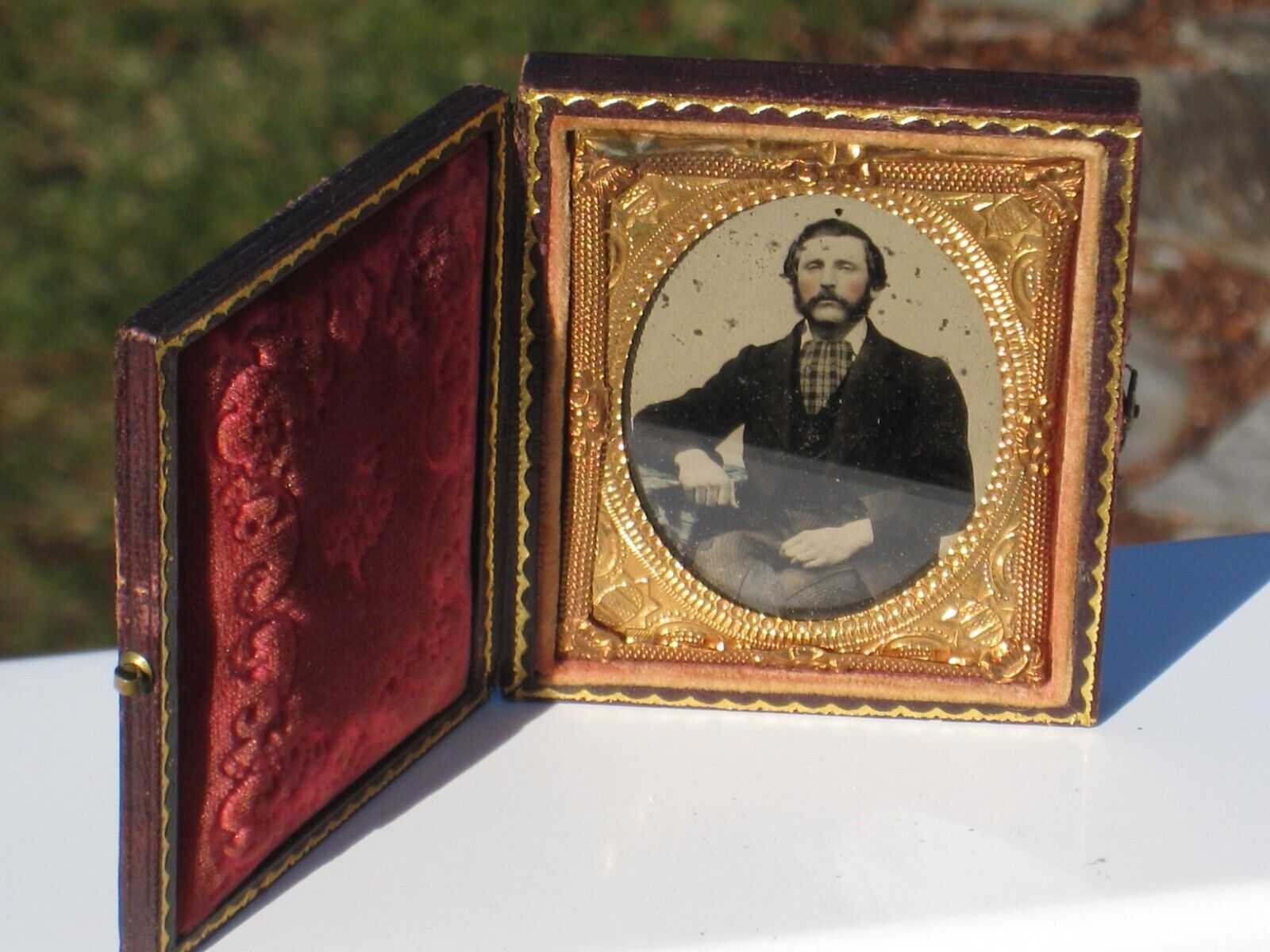 Title (ebay affiliate link): Early Tin Type Photo in a Stamped Leather Frame