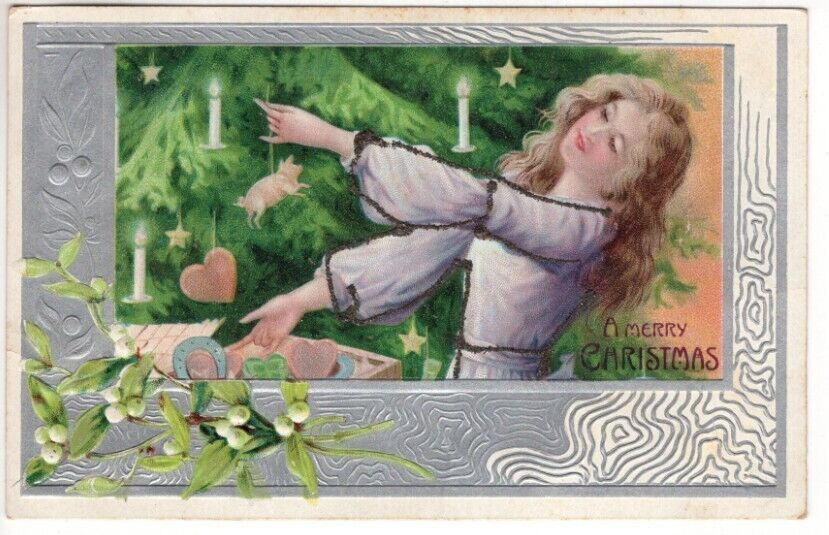 Title (ebay affiliate link): ANTIQUE EMBOSSED CHRISTMAS Postcard YOUNG GIRL DECORATING CHRISTMAS TREE