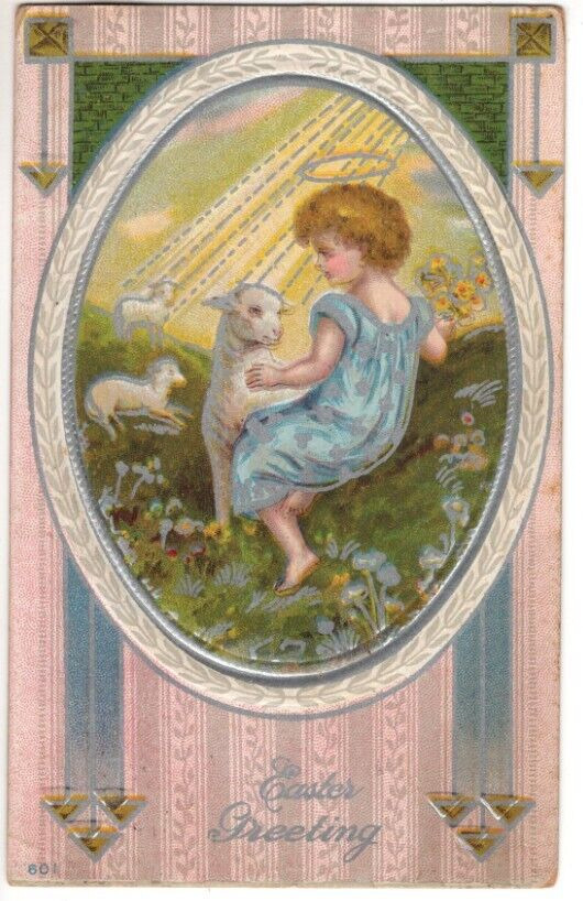 Title (ebay affiliate link): ANTIQUE EMBOSSED EASTER Postcard SUN SHINING ON YOUNG GIRL WITH LAMBS IN FIELD