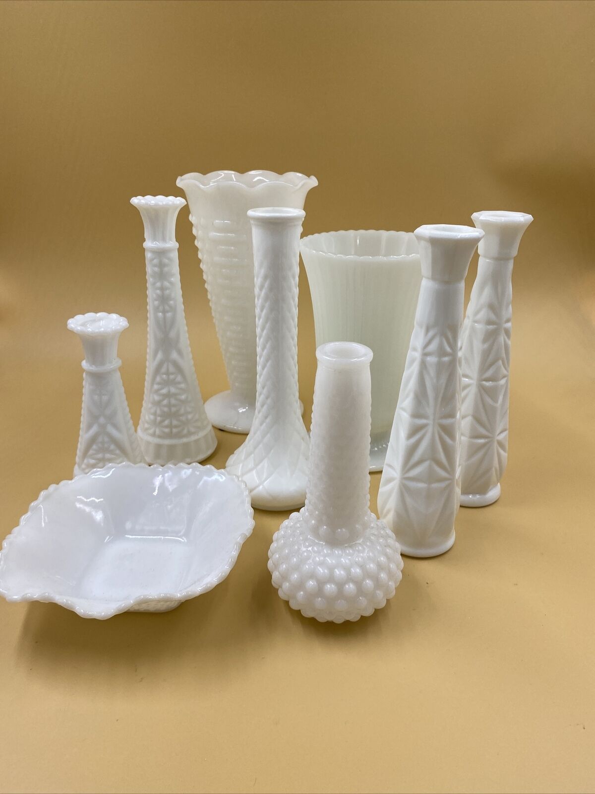 Lot of 10 Assorted Vintage Milk Glass Vases Bowls Etc