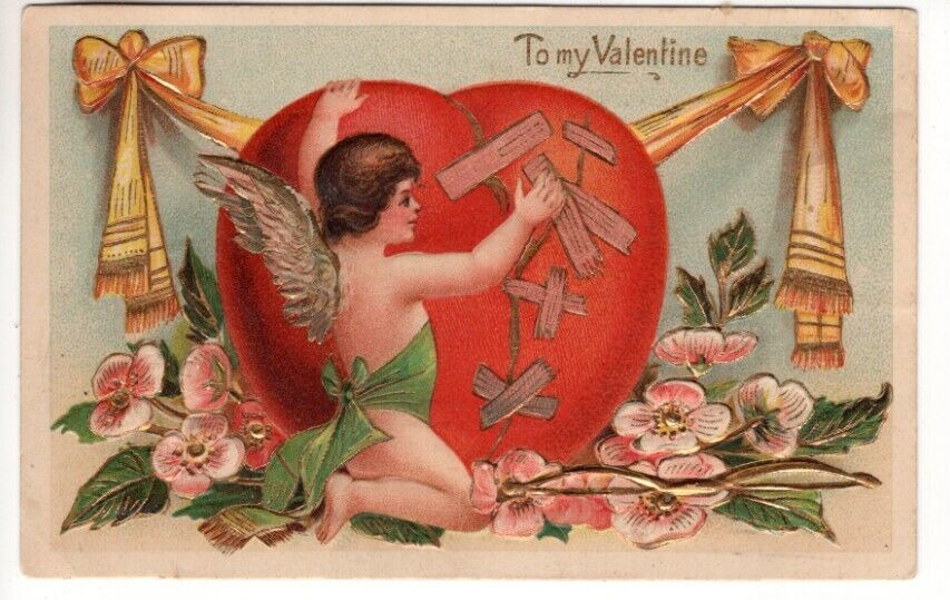 Title (ebay affiliate link): ANTIQUE EMBOSSED VALENTINE Postcard CUPID BANDAGING BROKEN HEART