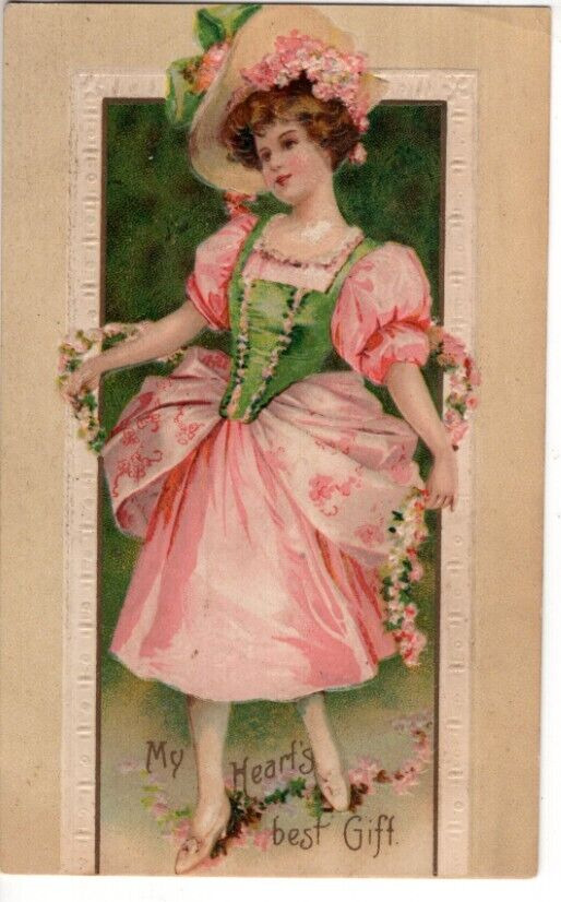 ANTIQUE EMBOSSED VALENTINE Postcard YOUNG LADY PINK AND GREEN DRESS GARLAND