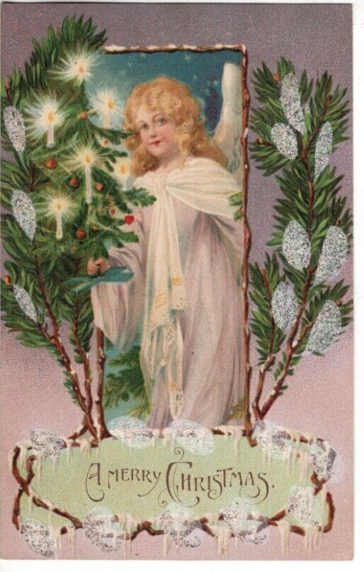 Title (ebay affiliate link): ANTIQUE CHRISTMAS Postcard ANGEL CANDLES ON CHRISTMAS TREE