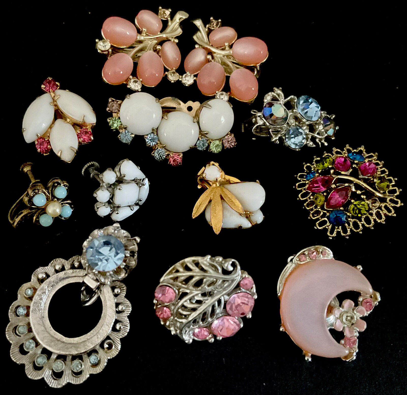 Vintage 10 Single 1 Pr. Earring LotMilk GlassRhinestonesPink FAUX Moonstone
