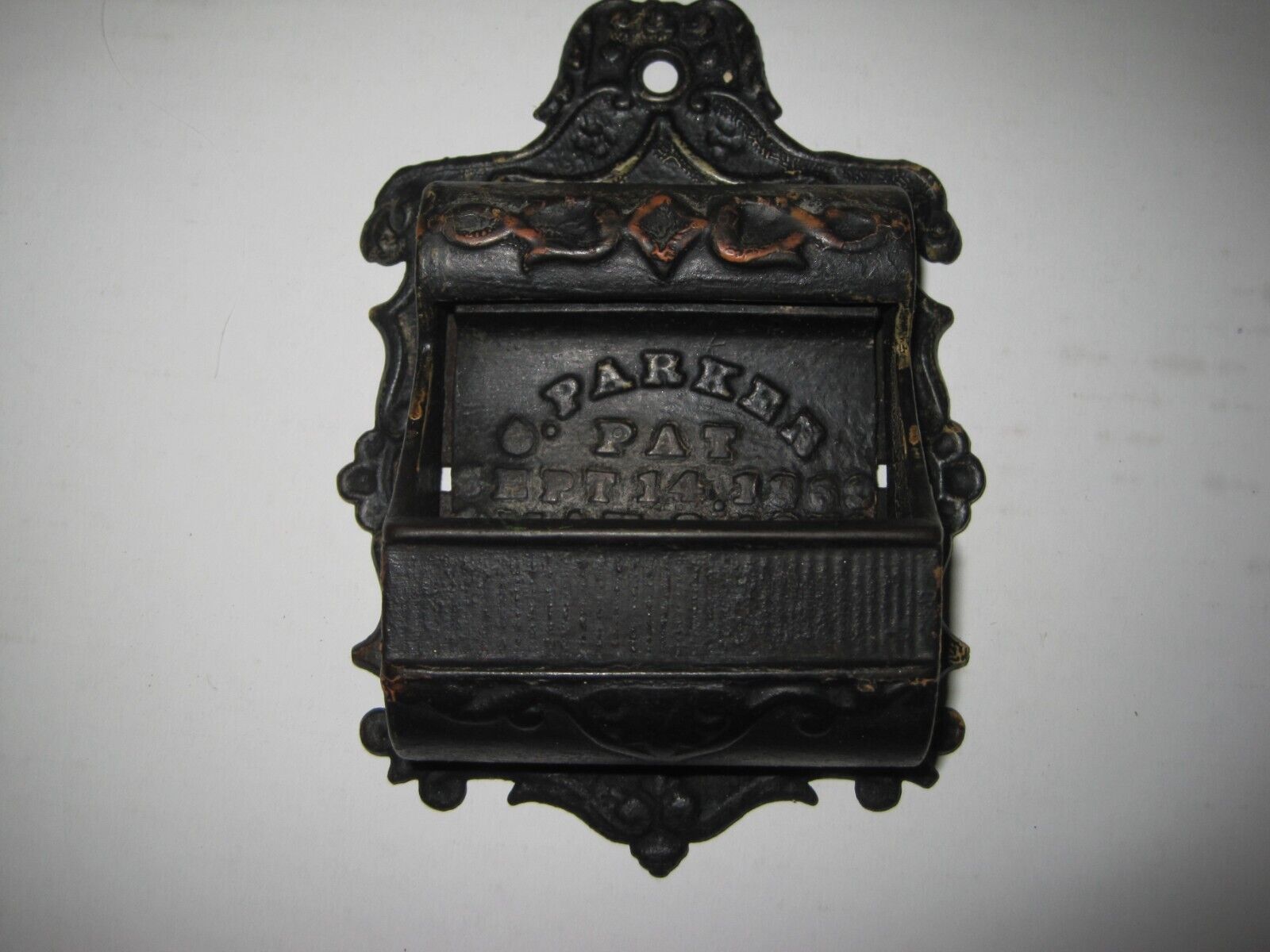 Title (ebay affiliate link): Antique Cast Iron Wall Mount Match Box Safe Holder C. PARKER PAT. 1869 1870